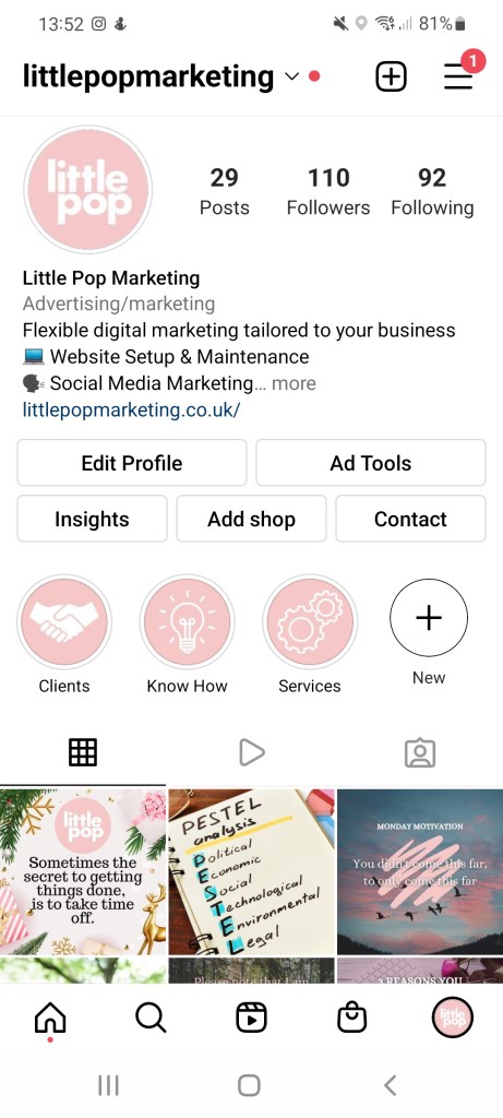 Let’s take a look at what Little Pop Marketing looks like at a glance, to new followers.